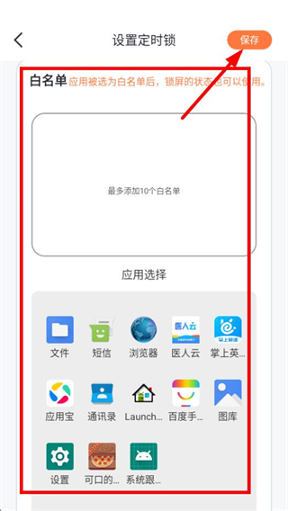 3、在设置定时锁页面,选择白名单应用后,点击保存按钮完成定时锁设置。