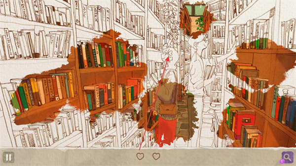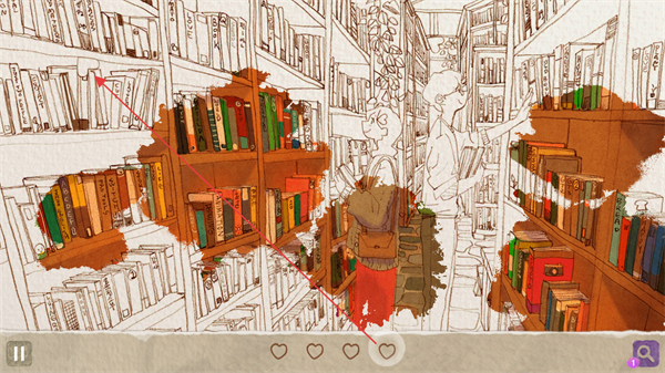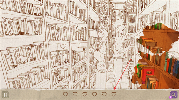 2、继续点击画面中黑白书籍区域,填充色彩,下方爱心会随操作减少,推进场景还原。