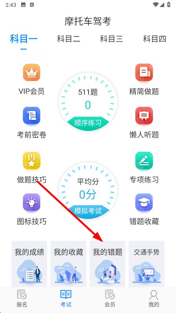 2、在考试界面里,找到并点击我的错题选项,进入错题库查看页面。