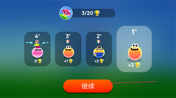 4、关卡结束显示排名,获得对应奖杯,点击继续进入下一关。