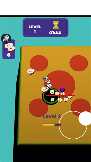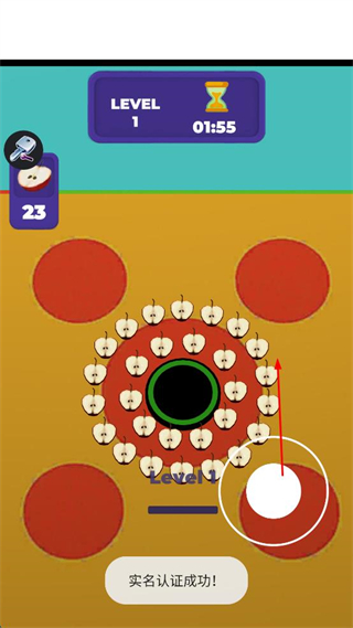 1、Level1界面中点击右下角白色按钮,按红色箭头指示方向发射苹果,使苹果进入旋转的苹果圈中。