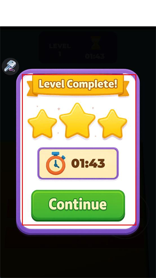 3、完成Level1后显示三星评级和用时01:43,点击绿色继续按钮进入下一关。