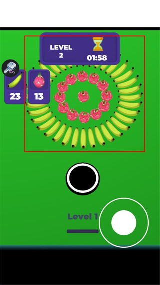 4、Level2界面中有香蕉和火龙果,按相同方式发射水果,使同类水果相连消除。