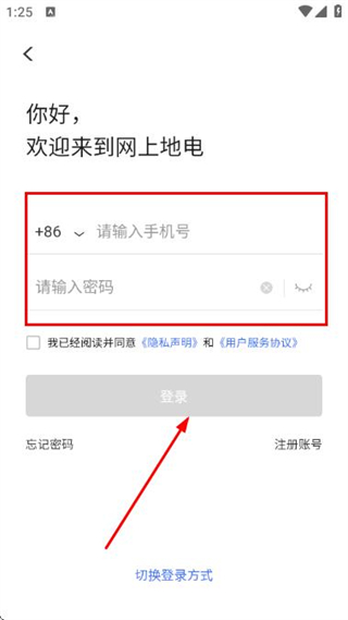 3、在密码登录页面填写手机号和密码,勾选协议后,点击登录按钮完成账号登录操作。