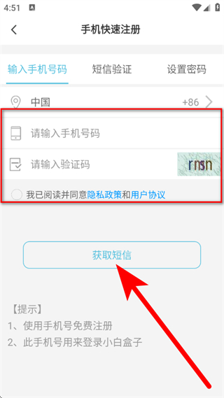 2、在手机快速注册页面,输入手机号码,勾选协议后,点击获取短信。