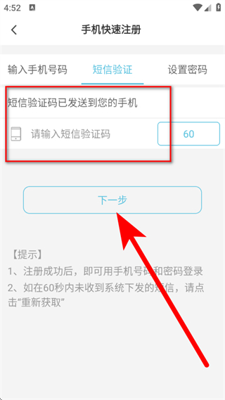 3、在短信验证页面,输入短信验证码,点击下一步。