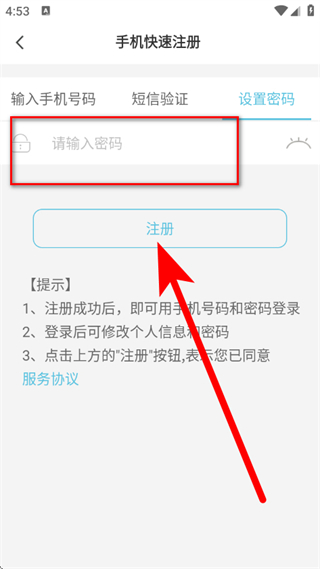 4、在设置密码页面,设置密码后,点击注册,完成注册。