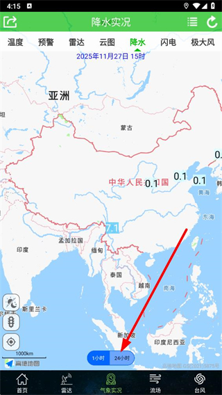 3、在降水实况界面,找到下方的24小时的选项并点击。