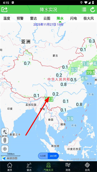 4、切换后界面会展示24小时内不同区域的降水数据,可直观了解大范围的降水趋势及分布状态。