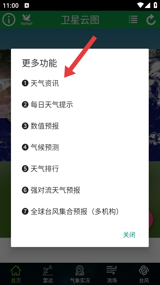 1、在卫星云图界面,点击右上角的菜单图标,弹出功能选项列表。