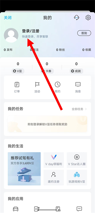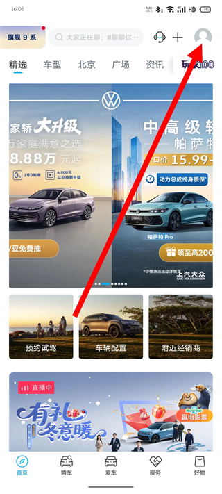 1、打开上汽大众,在主界面点击右上角头像图标,进入个人页面。