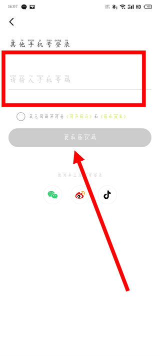 3、在登录页面,输入手机号码,勾选协议后,点击获取验证码。