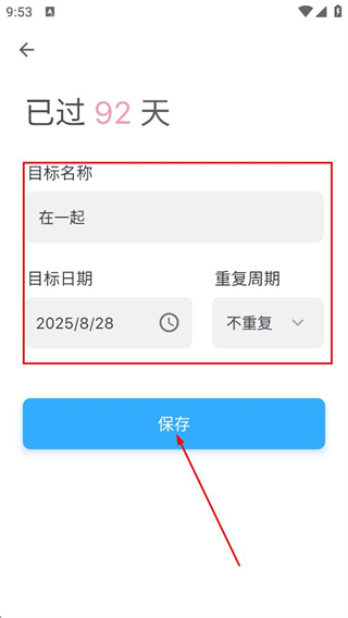 2、在目标日添加页面,填写目标名称,选择目标日期后,点击保存按钮。