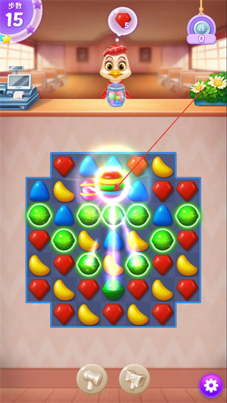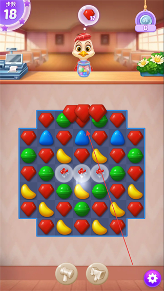 3、触发特殊道具如汉堡形糖果,可实现大范围消除,快速收尾剩余红宝石。
