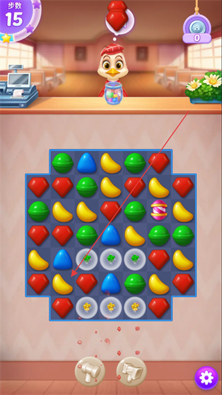 2、观察糖果棋盘,通过交换相邻糖果,让3个及以上相同糖果连成一线,触发消除并收集红宝石。