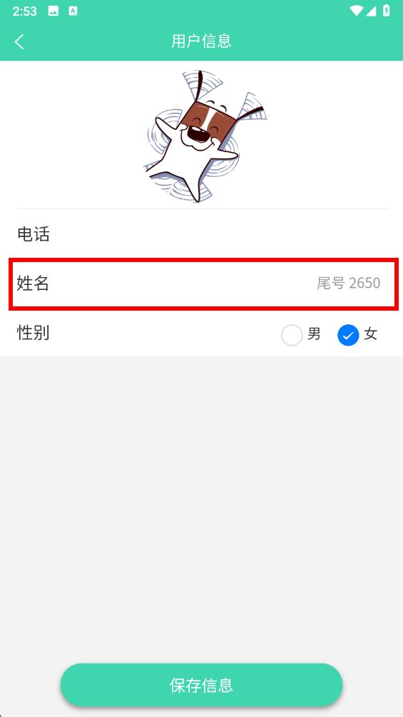 4、点击姓名选项,在弹出的输入框中输入新的名字,输入完成后点击保存信息,即可完成名字的修改。