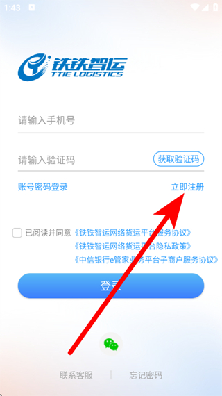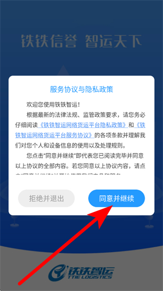 1、打开铁铁智运,在隐私政策弹窗中,点击同意并继续。