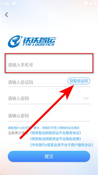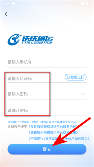 4、输入验证码,设置并确认密码后,点击提交,完成注册。