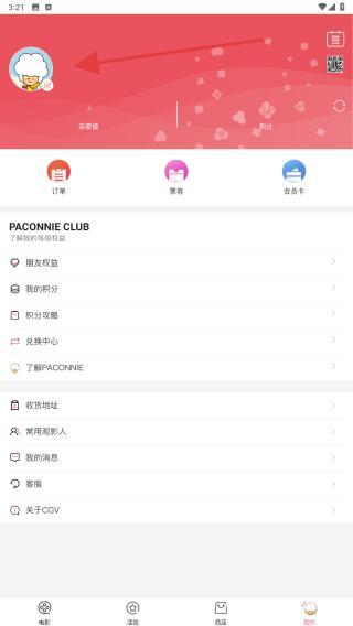 1、打开CGV影城APP,进入到个人中心页面内,点击头像的区域。