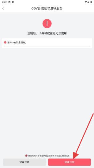 4、注销后,卡券和权益都无法使用,了解后点击继续注销即可。