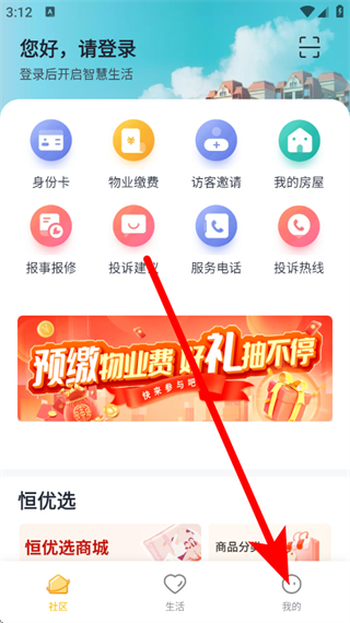 1、打开恒大智慧社区,在主界面点击底部我的,进入个人中心页面。
