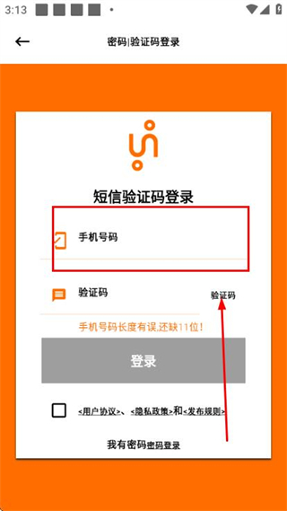 2、在手机验证登录页面填写手机号,勾选协议后,点击获取验证码。
