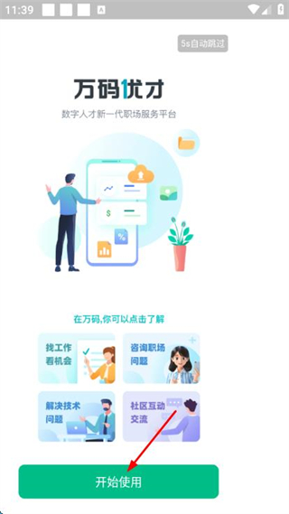 1、在万码优才的引导页,点击开始使用按钮,进入手机号登录注册页面。