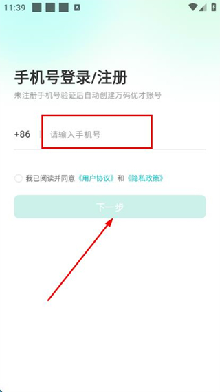 2、在手机号登录注册页面,填写手机号,勾选协议后点击下一步。