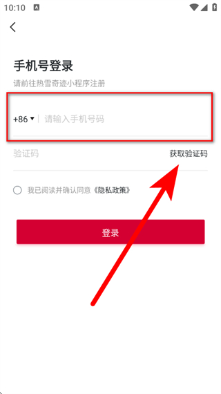 3、在手机号登录页面,输入手机号码,点击获取验证码。
