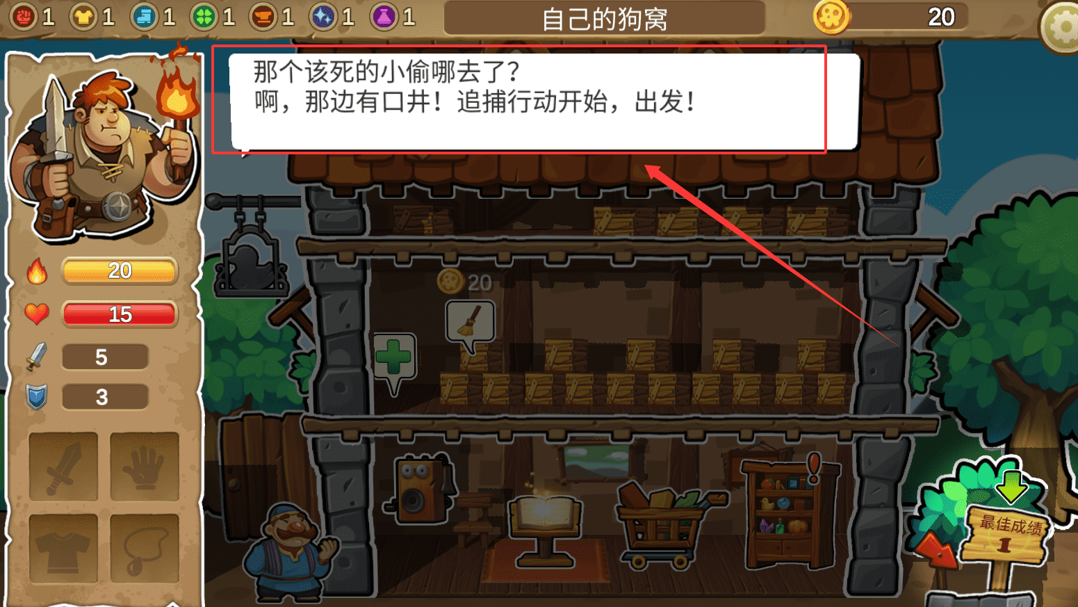 1、核心目标是追踪偷鸡贼夺回火鸡,通过连续点击探索暗黑区域扩大可视范围,收集钥匙装备与合成素材,同时注意维持生命值。