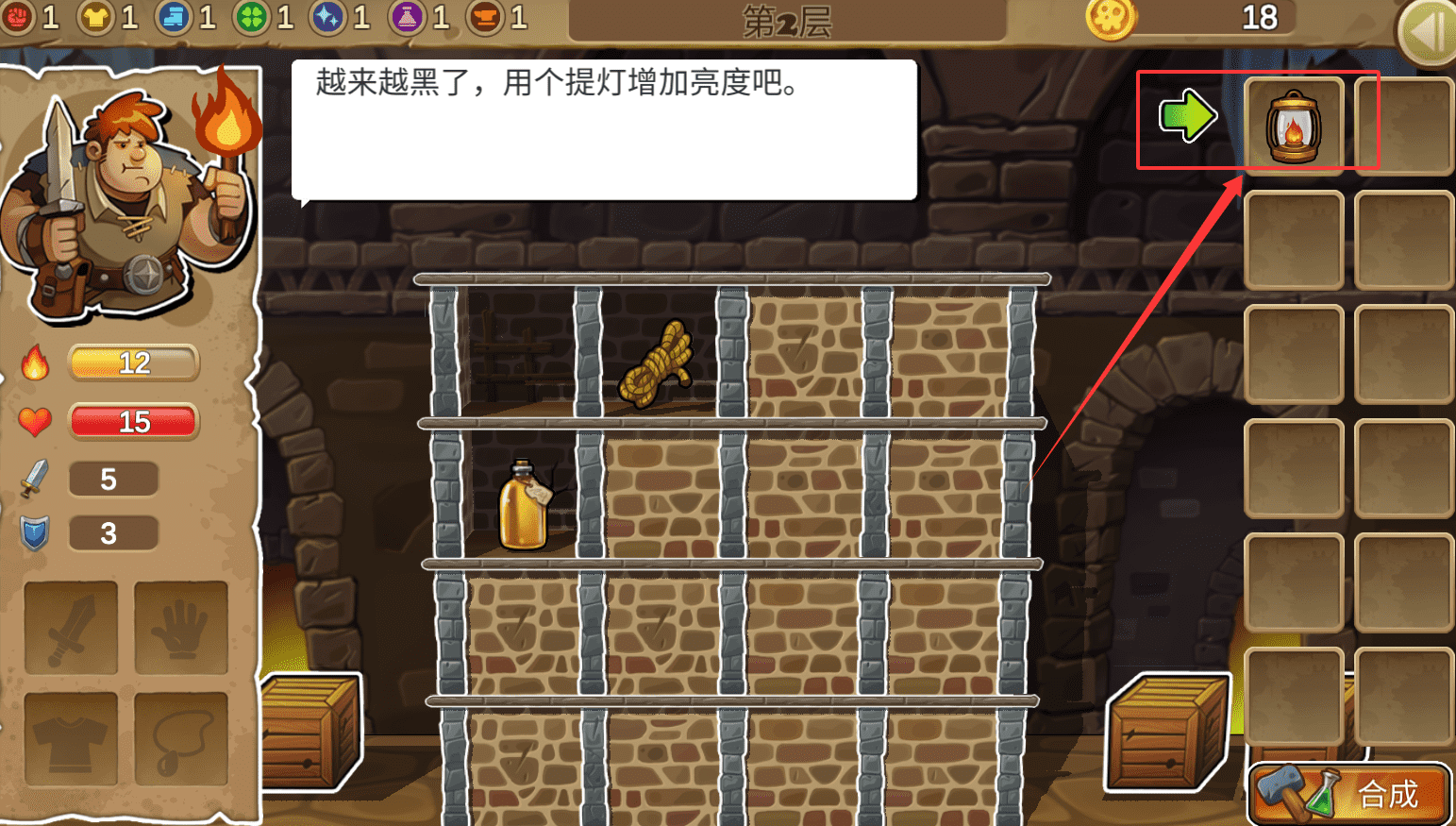 2、找到钥匙即可开启通往下一层的大门或宝箱,建议优先选择下楼继续冒险。若状态不佳,可利用现有素材合成装备或药剂。