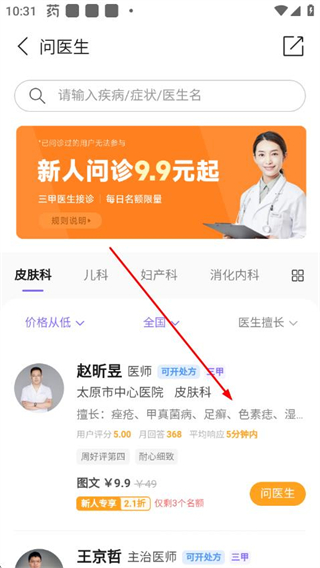 2、在问医生页面选择对应科室,找到目标医生并点击进入医生详情页。