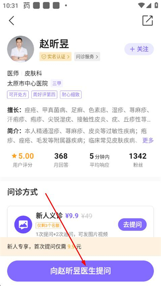 3、在医生详情页点击向赵昕昱医生提问,完成问诊流程。
