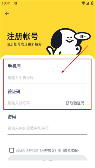 4、在注册帐号页面,输入手机号码,点击获取验证码后,填写收到的验证码。