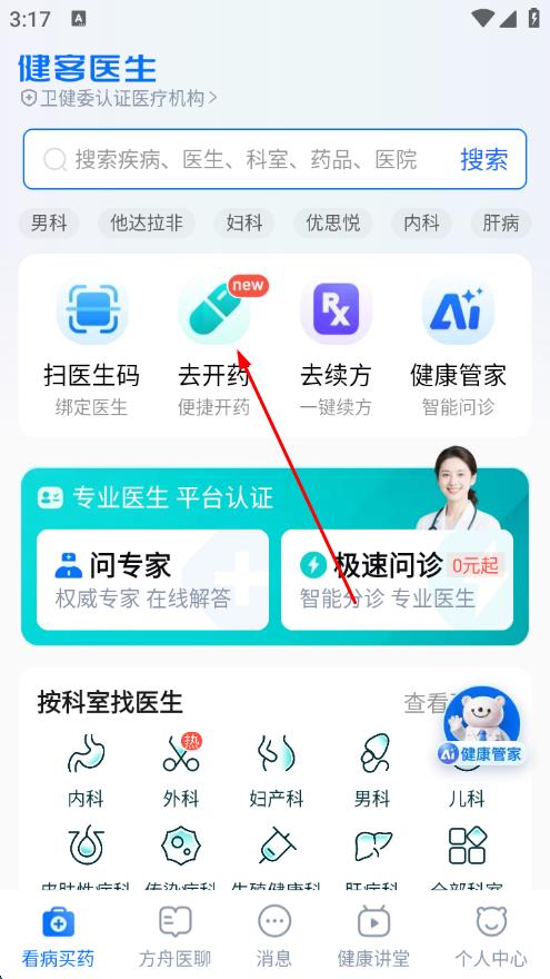 1、打开健客医生APP,在首页点击去开药选项。