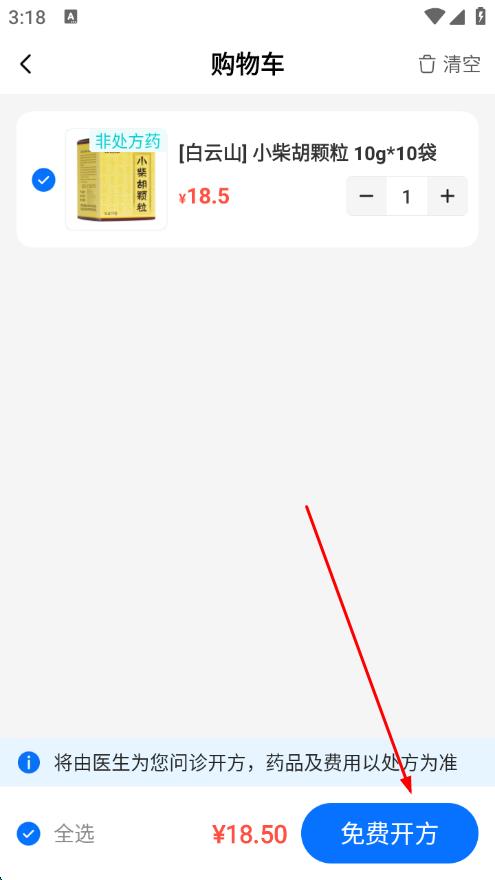 3、点击底部的“购物车”图标,进入购物车页面,点击免费开方。