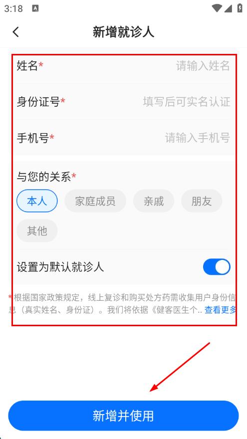 4、在新增就诊人页面,填写信息,点击新增并使用,即可完成买药。