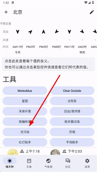 1、在工具板块找到光污染选项并点击,进入光污染对应的地图展示页面。