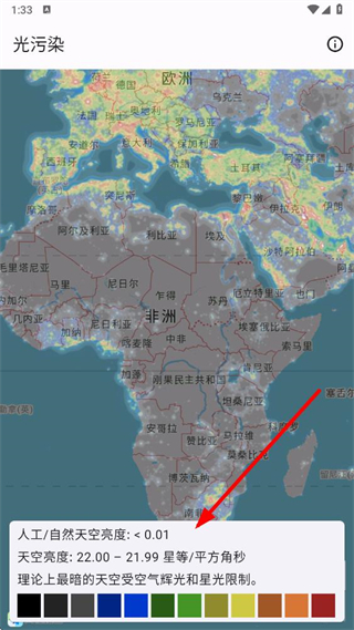 2、在光污染页面,查看底部图例,点击对应颜色方块可了解其代表的光污染程度含义。