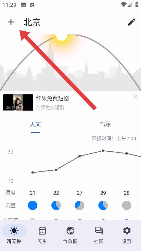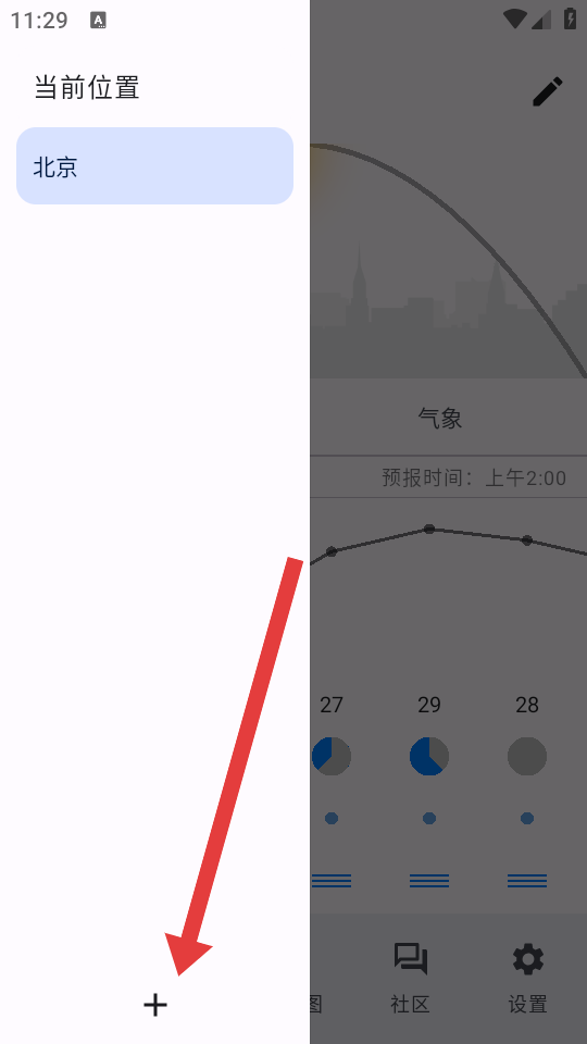 1、在晴天钟主界面,点击左上角的+号按钮,弹出位置选择侧边栏。