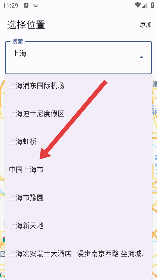 3、在选择位置页面的搜索框中输入城市名称,并从搜索结果中选择目标城市。