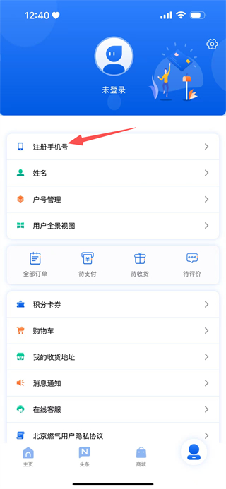 2、在我的页面,点击注册手机号,进入登录界面。