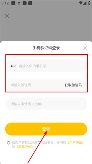 3、在手机验证码登录页面填写手机号和验证码,勾选协议后,点击登录完成账号登录操作。