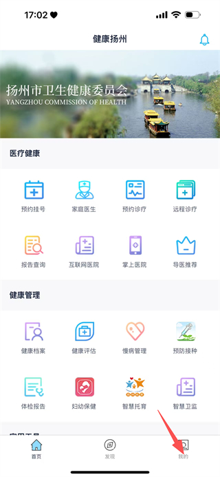 1、在健康扬州首页,点击底部导航栏的我的,进入个人页面。