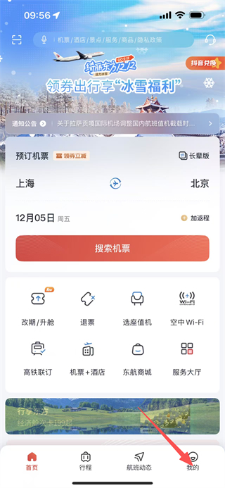 1、在掌上东航应用首页,点击底部我的,进入个人页面。