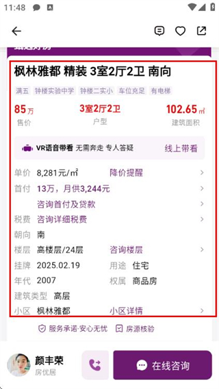 2、在二手房房源列表页面点击目标房源,进入该房源的详情页面。