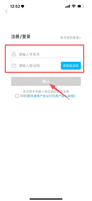 3、在注册/登录页面,填写手机号,验证码,点击确认,完成账号注册操作。
