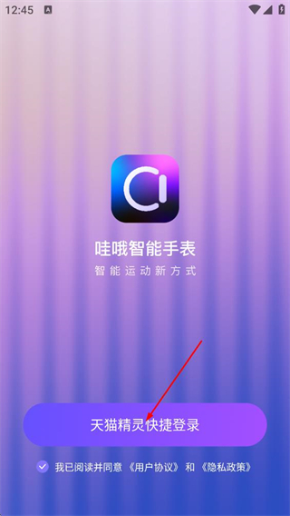 1、在哇哦智能手表的登录页面,点击天猫精灵快捷登录,进入登录页面。