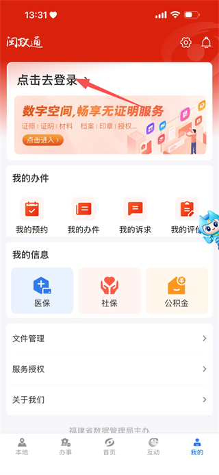 1、在闽政通首页,点击底部导航栏的我的,进入个人页面。