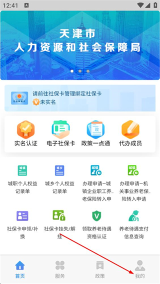 1、在天津市人社局首页,点击底部我的,进入个人页面。